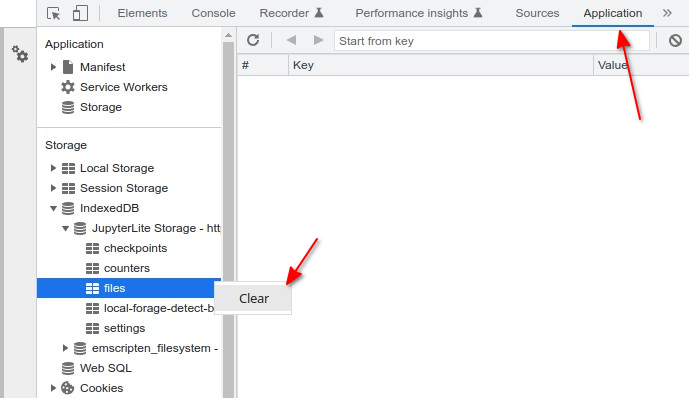 Chrome Settings -> More tools -> Developer tools -> Application -> Storage -> IndexedDB -> JupyterLite Storage -> Right click files -> Clear